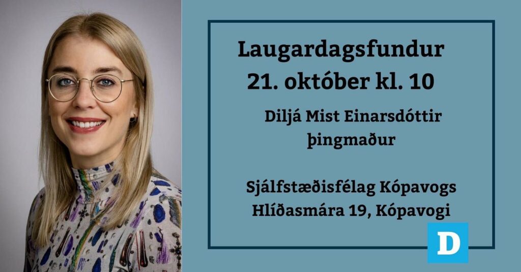 Sjálfstæðisflokkurinn í Kópavogi | Facebook Diljá Mist Einarsdóttir, þingmaður og formaður utanríkismálanefndar Alþingis,verður gestur okkar á næsta laugardagsfundi. En af