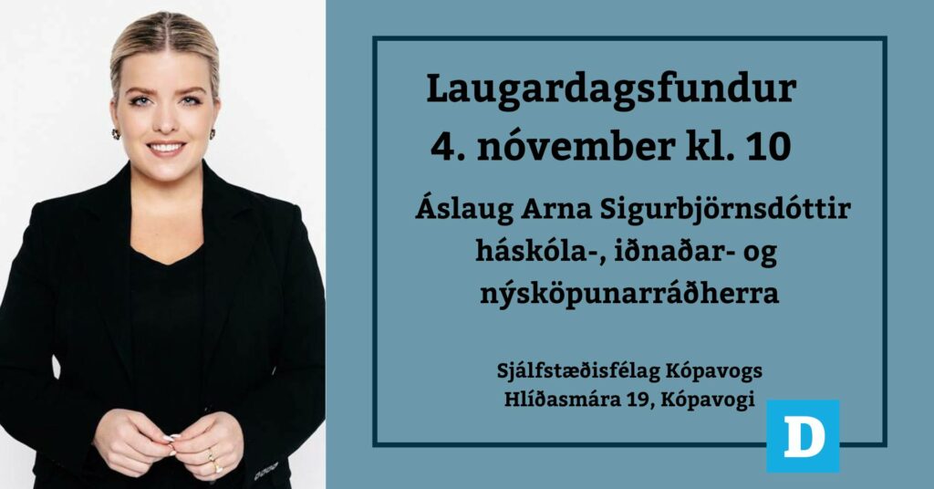 Laugardagsfundur | Facebook Áslaug Arna Sigurbjörnsdóttir, háskóla-, iðnaðar- og nýsköpunarráðherraverður gestur okkar laugardaginn 4. nóvember – eftir gott vetrarfrí síðustu