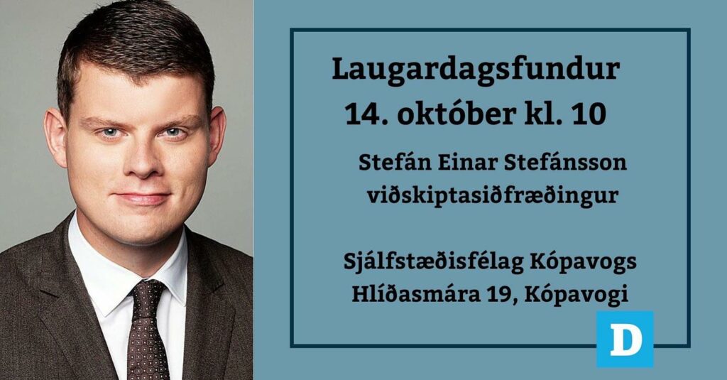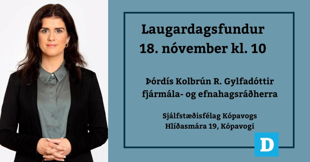 Laugardagsfundur | Facebook Þórdís Kolbrún Reykfjörð Gylfadóttir,fjármála- og efnahagsráðherra og varaformaður Sjálfstæðisflokksins,verður gestur okkur á næsta laugardagsfundi, 18. nóvember, kl.10:00í