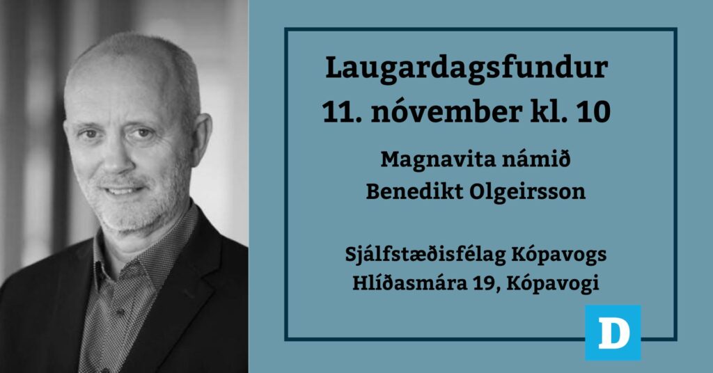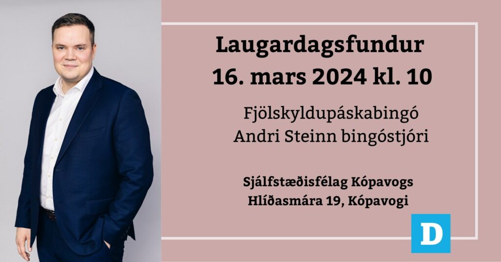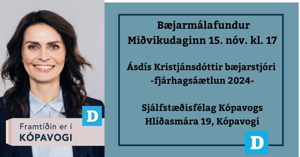 Bæjarmálafundur – kynning á fjárhagsáætlun 2024 | Facebook Bæjarmálafundur verður haldinn miðvikudaginn 15. nóvember kl. 17:00.í sal Sjálfstæðisfélags Kópavogs, Hlíðarsmára