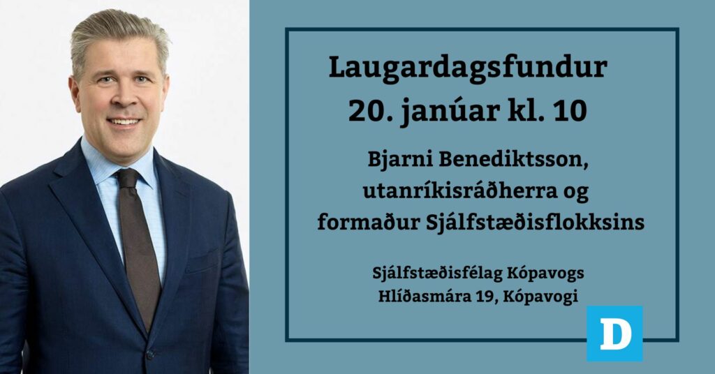 Laugardagsfundur – Bjarni Benediktsson | Facebook Bjarni Benediktsson, utanríkisráðherra og formaður Sjálfstæðisflokksins,verður gestur okkar á fyrsta laugardagsfundi ársins, 20. janúar