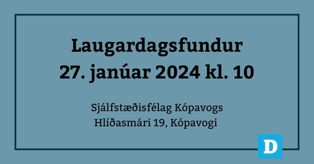 Laugardagsfundur | Facebook Laugardagsfundur, kl.10:00í sal Sjálfstæðisfélags Kópavogs, Hlíðarsmára 19.Hittumst og spjöllum og fáum okkur kaffi og meðlæti. Orðið er