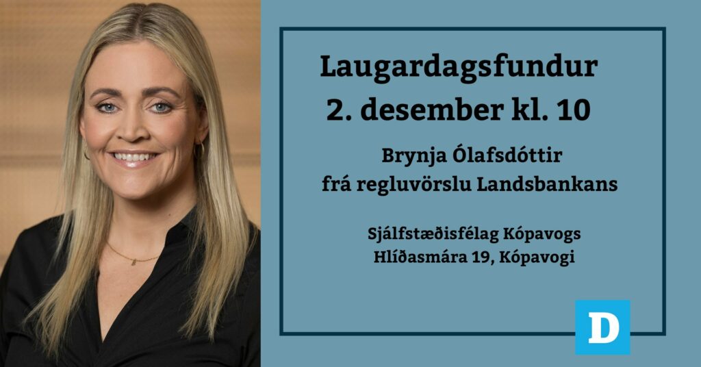Laugardagsfundur | Facebook Brynja María Ólafsdóttir, sérfræðingur í regluvörslu hjá Landsbankanum,verður gestur okkar á lagardaginn 2. desember, kl.10:00í sal Sjálfstæðisfélags