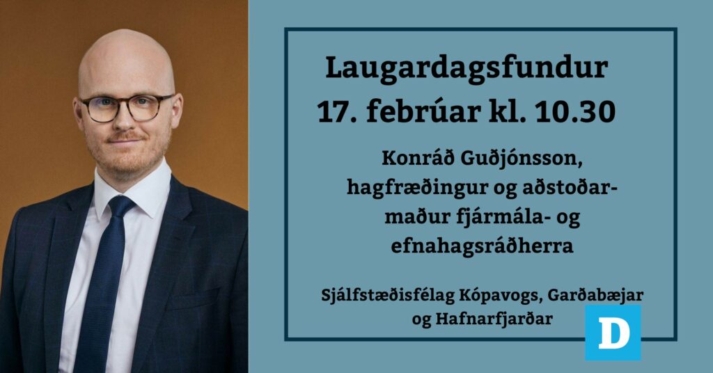 Konráð Guðjónsson, hagfræðingur og aðstoðarmaður fjármála- og efnahagsráðherra,verður gestur sjálfstæðisfélaganna í Kópavogi, Garðabæ og Hafnarfirðilaugardaginn 17. febrúar kl. 10:30. Konráð