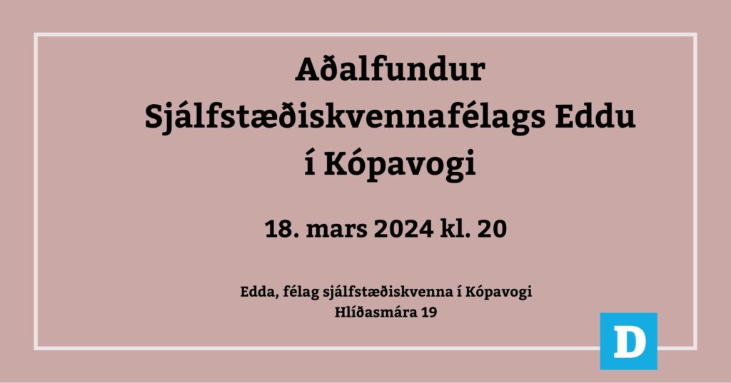 Aðalfundur Eddu, félag sjálfstæðiskvenna í Kópavogiverður haldinn mánudaginn 18. mars, kl. 20:00, að Hlíðasmára 19. Dagskrá:1. Skýrsla stjórnar2. Samþykkt reikninga3.