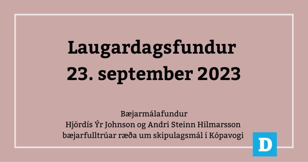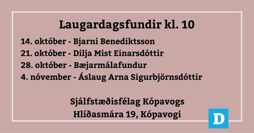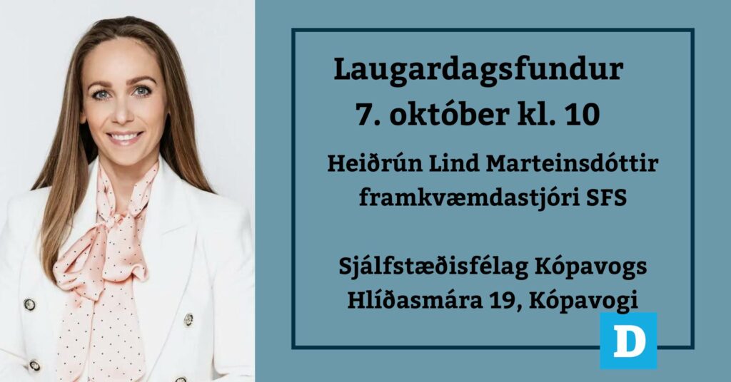 Laugardagsfundur | Facebook Allir velkomnir á opinn fund í sal Sjálfstæðisfélags Kópavogs,Hlíðarsmára 19, kl.10:00. Hjördís Ýr Johnson, bæjarfulltrúi og formaður