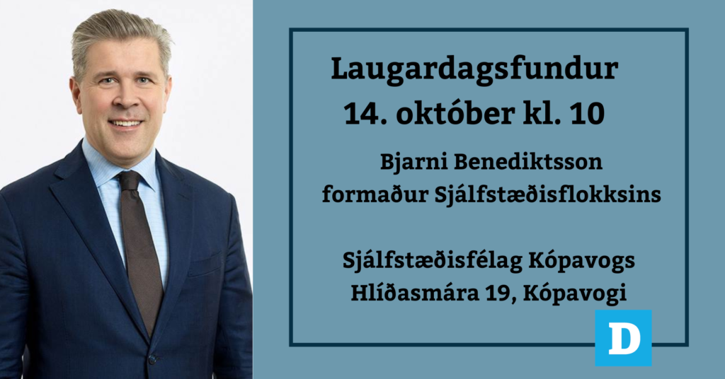 Laugardagsfundir kl. 10í sal Sjálfstæðisfélags Kópavogs, Hlíðarsmára 19: 14. október – Bjarni Benediktsson v. forfalla – Stefán Einar Stefánsson21. október