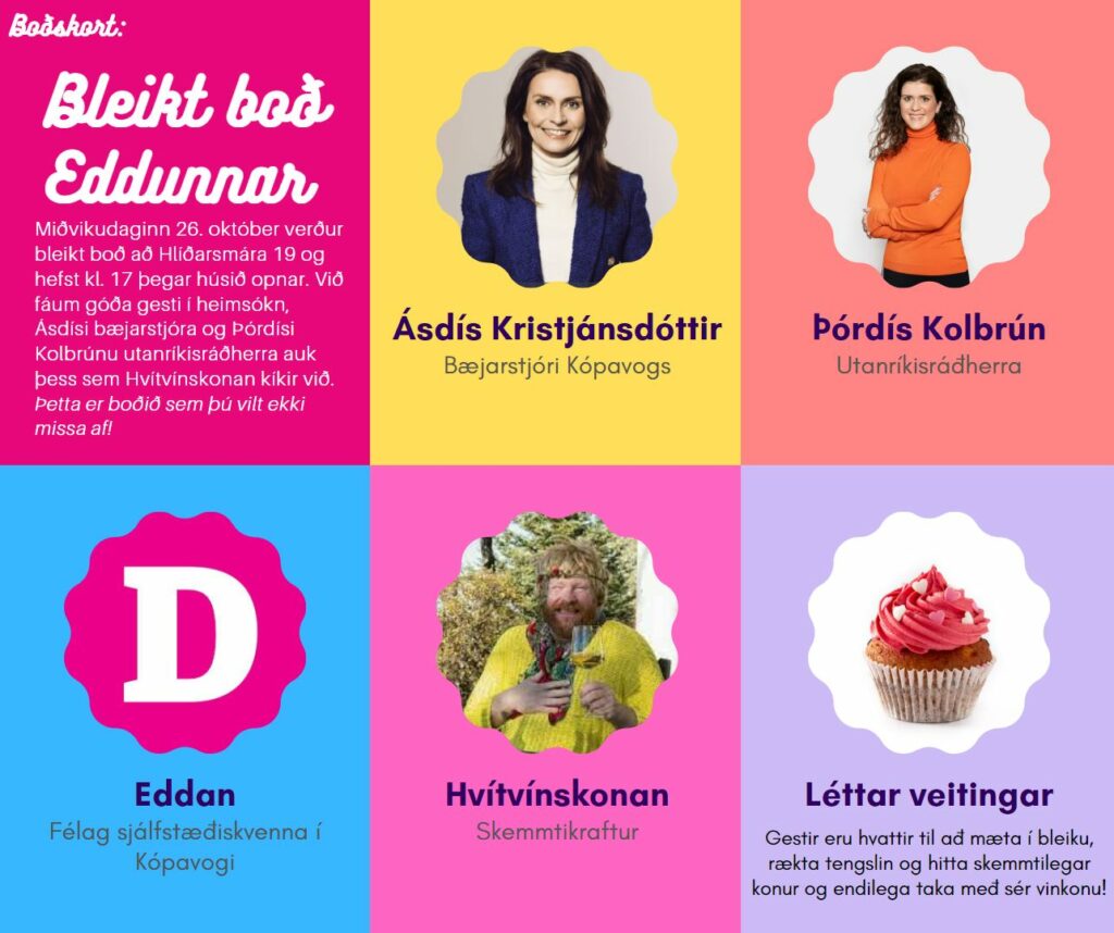 Félag sjálfstæðiskvenna í Kópavogi, Eddan, heldur bleikt boð að Hlíðarsmára 19, miðvikudaginn 26. október. Húið opnar kl. 17. Þórdís Kolbrún