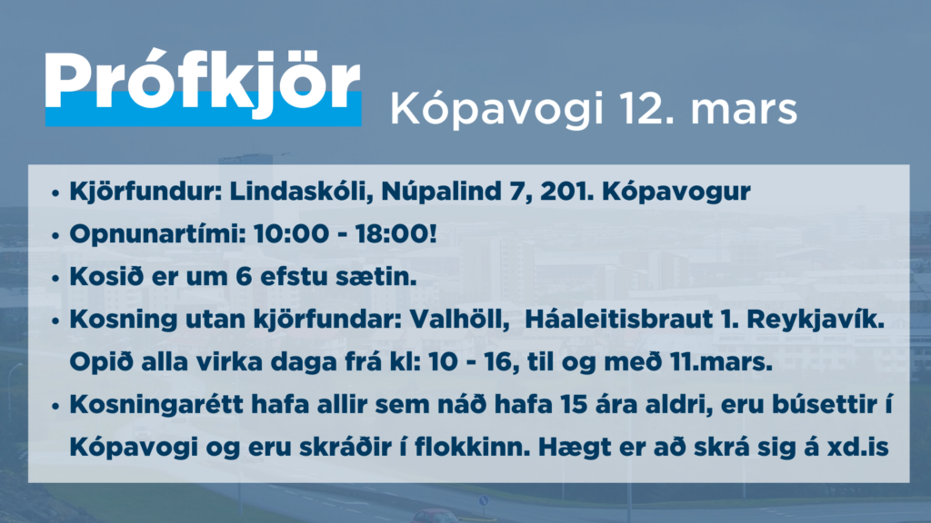 Auglýst er eftir framboðum til prófkjörs Sjálfstæðisflokksins í Kópavogi fyrir komandi sveitarstjórnarkosningar. Framboðum ber að skila með rafrænum hætti til